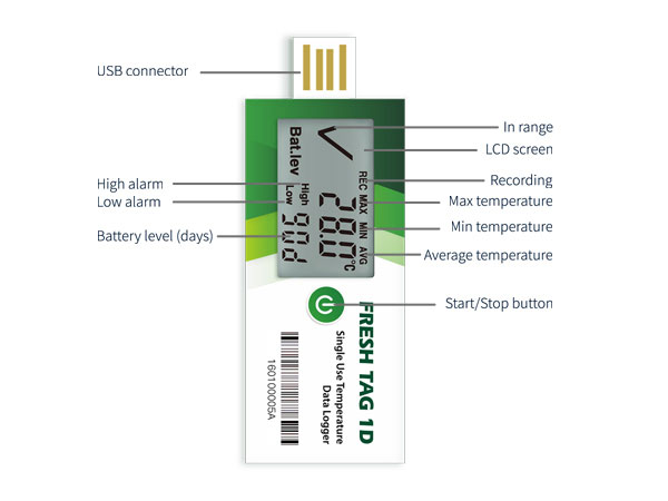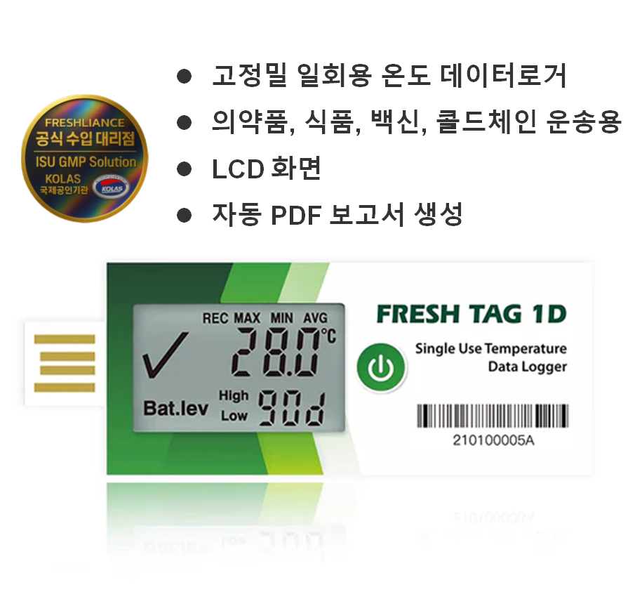 Fresh Tag 1D는 식품, 의약품, 화학제품 등의 저온 유통(콜드체인) 환경에서의 온도 변화 추적을 위한 LCD 일회용 온도 데이터로거입니다.