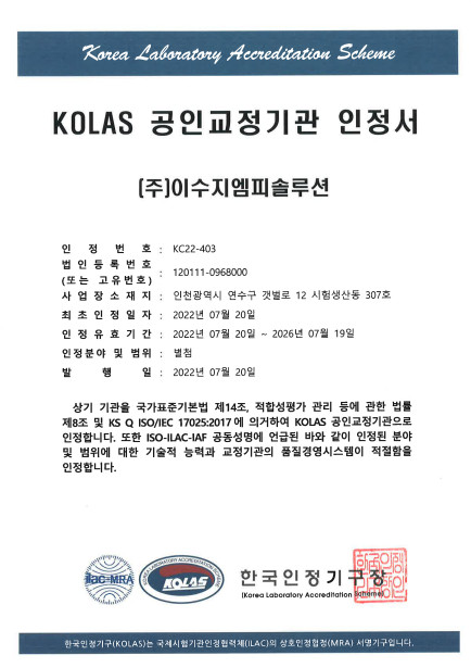 (주)이수지엠피 솔루션은 FRESHLIANCE 사의 한국 공식 대리점 이며, KOLAS 국제 공인 기관 입니다.