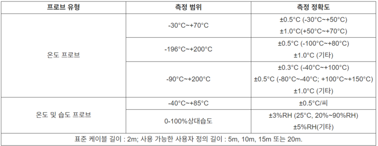 내장 센서 외에 온도/습도 외부 프로브를 최대 2개까지 추가 가능하며, 각각 개별로 기록 및 내보내기가 가능합니다.