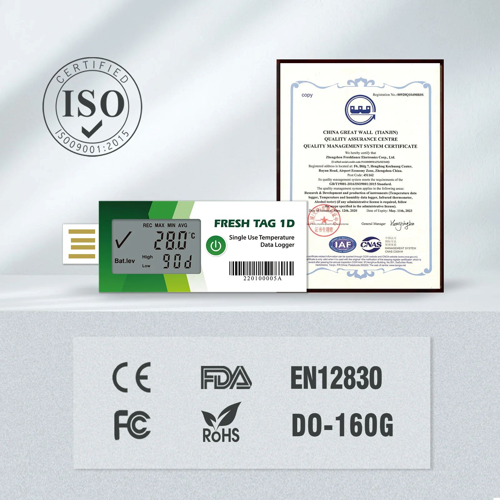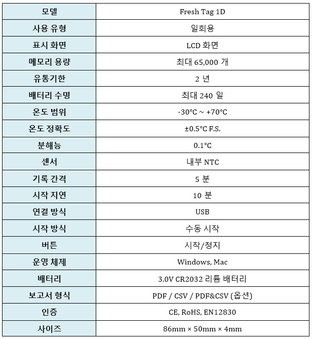 Fresh Tag 1D는 식품, 의약품, 화학제품 등의 저온 유통(콜드체인) 환경에서의 온도 변화 추적을 위한 LCD 일회용 온도 데이터로거입니다.