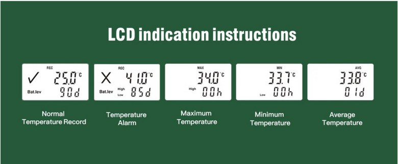 LCD 화면 탑재: 실시간 온도, 최대/최소/평균값 및 배터리 상태, 알람 표시