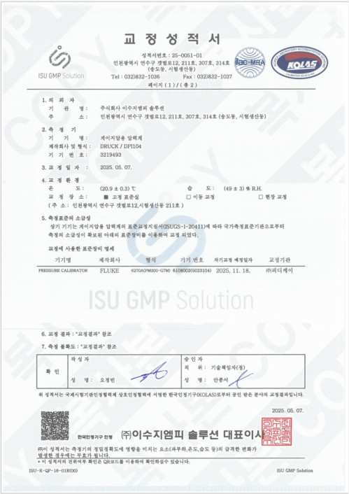 이수지엠피솔루션은 KOLAS 국제공인기관으로 교정 직접 수행