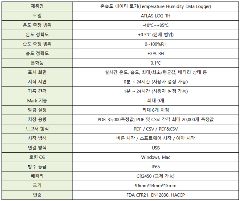 Atlas Log‑TH는 -40℃에서 +85℃까지의 온도 환경에서 온습도 데이터를 정확하게 측정하고 기록할 수 있는USB 온습도 데이터로거입니다. PDF/CSV 자동 보고서 생성, 외부 프로브 방식, 배터리 교체 가능, LCD 디스플레이 탑재 등 다양한 기능을 갖추어 콜드체인, 제약, 식품 물류 등 정밀한 온도 관리가 필요한 환경에 최적화된 제품입니다.